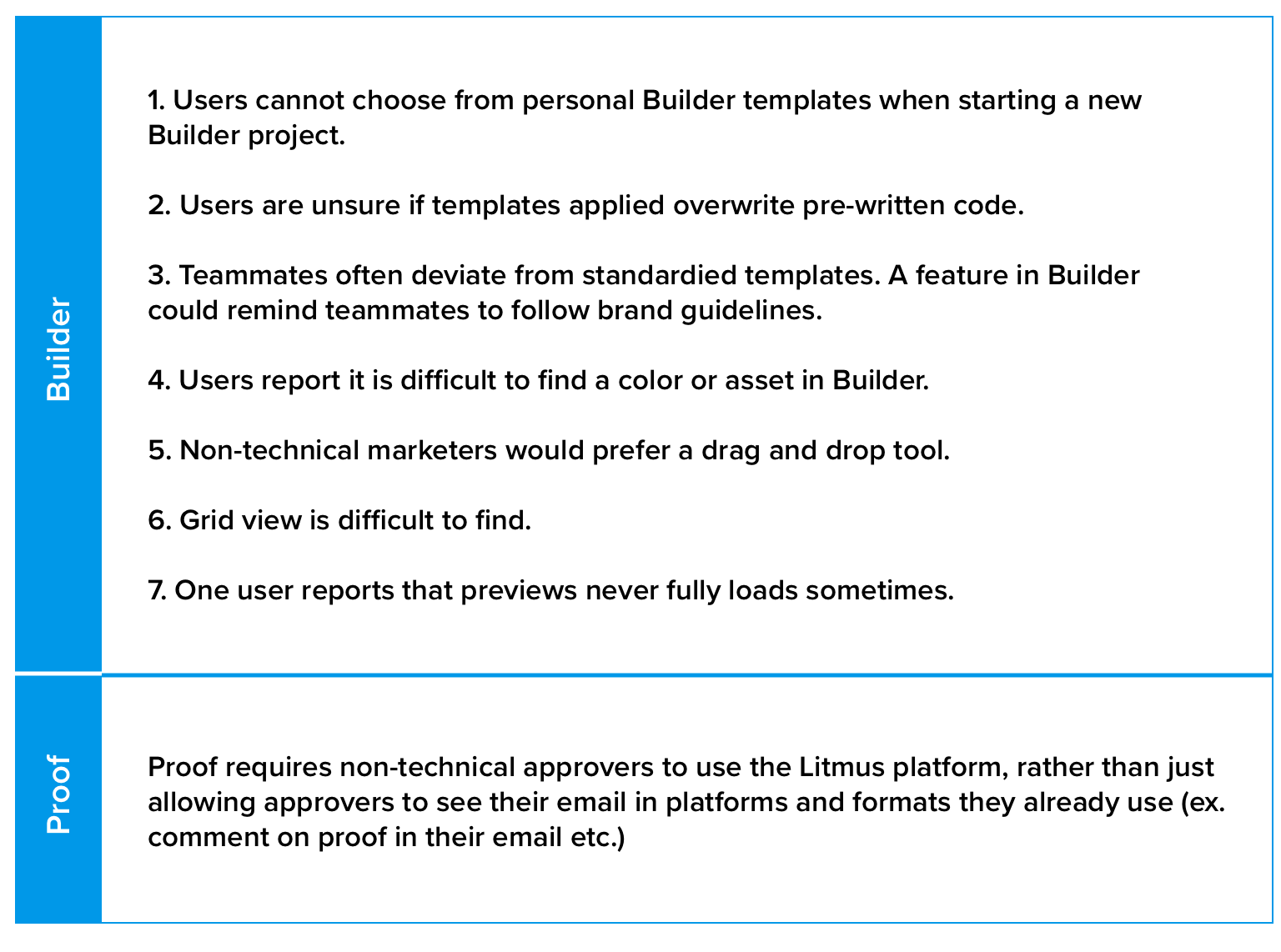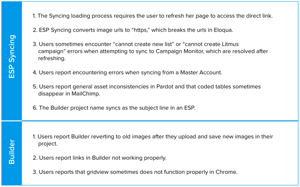Many users had more general feedback about the Litmus product, specifically focusing on two of Litmus' primary features, Builder and Proof. Below, I reported user feedback to suggest potential directions for product improvements.
